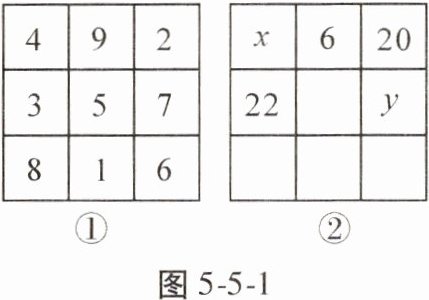 6. 将$9$个数填入幻方的空格中,要求每一横行,每一竖列以及两条对角线上的$3$个数之和相等,例如图$5 - 5 - 1$①就是一个幻方,图②是一个未完成的幻方,则$x与y$的和是多少?