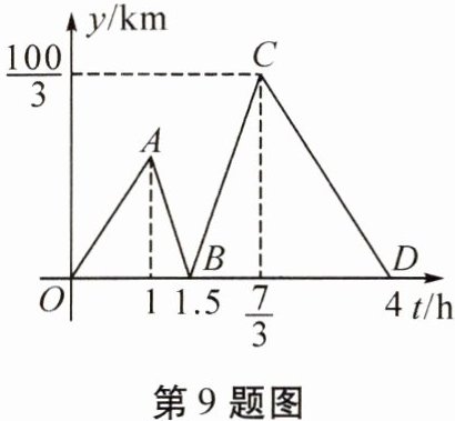 (1)由题意,设直线BC的函数表达式为y=kx+b,把(1.5,0),$(\frac {7}{3},\frac {100}{3})$代入,得$\left\{\begin{array}{l} 1.5k+b=0,\\ \frac {7}{3}k+b=\frac {100}{3},\end{array}\right.$所以$\left\{\begin{array}{l} k=40,\\ b=-60。\end{array}\right.$所以直线BC的函数表达式为y=40x-60。