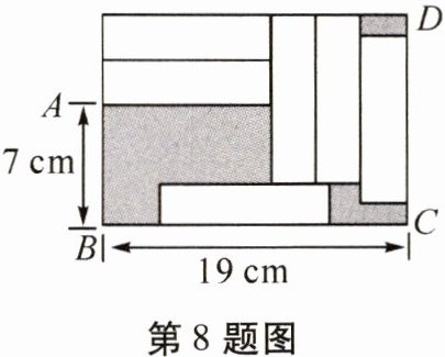 (1)设小长方形的长为x cm,宽为y cm,根据图形可知$\left\{\begin{array}{l} x+3y=19,\\ x+y=2y+7\end{array}\right.$解得$\left\{\begin{array}{l} x=10,\\ y=3。\end{array}\right.$答:小长方形的长为10 cm,宽为3 cm。