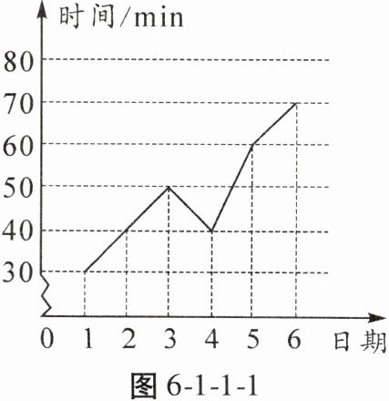 4. 如图6-1-1-1是嘉淇某月1号到6号用于体育锻炼的时间的折线统计图,则该组数据的众数是____。