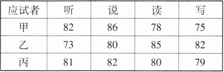 (2)如果这家公司想招一名口语能力较强的翻译,听、说、读、写成绩按照3:4:2:1的比例确定三名应试者的最终成绩,从他们的成绩看,应录取谁?