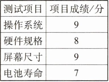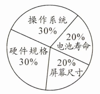 7. 测试中心分别从操作系统、硬件规格、屏幕尺寸、电池寿命四个项目对新投入市场的一款智能手机进行测评,这款手机的各项测评成绩及占综合成绩的比重如图6-1-2-4所示,则该手机测评的综合成绩为____分。