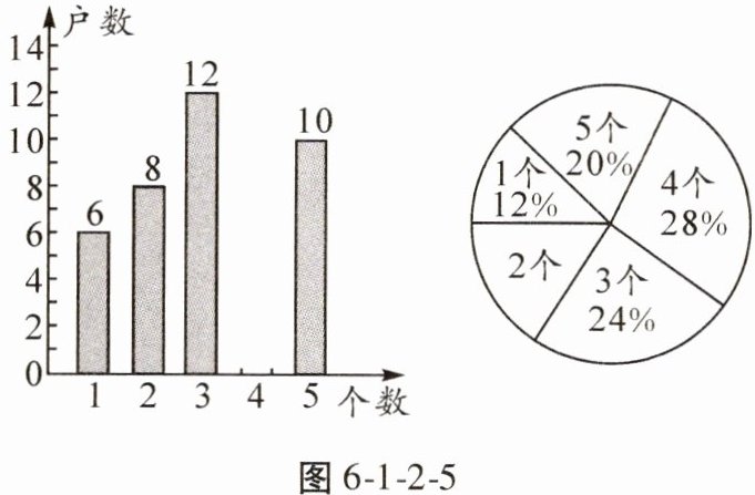 8. 为实现绿色可持续发展,倡导低碳生活,某市的商场、超市等场所均有偿使用可降解塑料袋。某小区为了了解每户家庭每周有偿使用可降解塑料袋的个数,随机抽取了若干户家庭,并对所抽取家庭每周有偿使用可降解塑料袋的个数进行统计,绘制成如图6-1-2-5所示的两幅统计图,请你根据统计图提供的信息,解答下列问题: