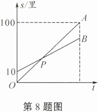 8. 我国古代数学的经典著作《九章算术》记载:“今有不善行者先行一十里,善行者追之一百里,先至不善行者二十里。问善行者几何里及之?”意思是:不善行者先走10里路,善行者追他,当善行者走到100里路时,超过了不善行者20里路。问善行者走到多少里路时就赶上不善行者?(“里”是我国传统长度单位)如图是善行者与不善行者行走路程$s$(单位:里)关于善行者的行走时间$t$的函数图象,则两图象交点$P$的纵坐标是( )