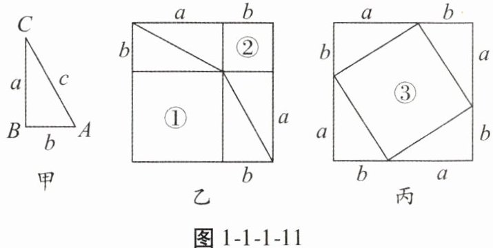 9. 如图1-1-1-11,图甲是一个直角三角形$ABC$,它的两条直角边长分别为$a$,$b$,斜边长为$c$。分别取四个全等的直角三角形$ABC$拼成图乙、图丙,放入边长为$a + b$的正方形之中。
