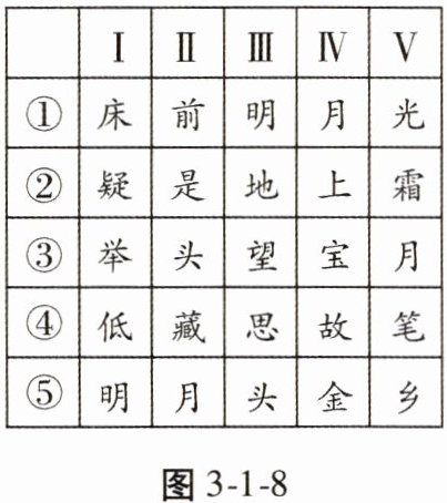 7. 在一次“寻宝”游戏中,“寻宝人”在如图 $ 3 - 1 - 8 $ 所示的 $ 25 $ 个方格的汉字中寻找“宝藏”,如 $ II⑤ $ 表示“月”,$ V① $ 表示“光”。若“寻宝人”沿着“$ IV③\toII④\toII②\toIV⑤\toV④ $”的路径去寻找“宝藏”,则他找到的“宝藏”是______。