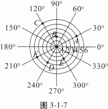 6. 如图 $ 3 - 1 - 7 $,雷达探测器测得六个目标 $ A $,$ B $,$ C $,$ D $,$ E $,$ F $ 出现。按照规定的目标表示方法,目标 $ C $,$ F $ 的位置表示为 $ C(6,120°) $,$ F(5,210°) $。按照此方法在表示目标 $ A $,$ B $,$ D $,$ E $ 的位置时,其中表示不正确的是( )
