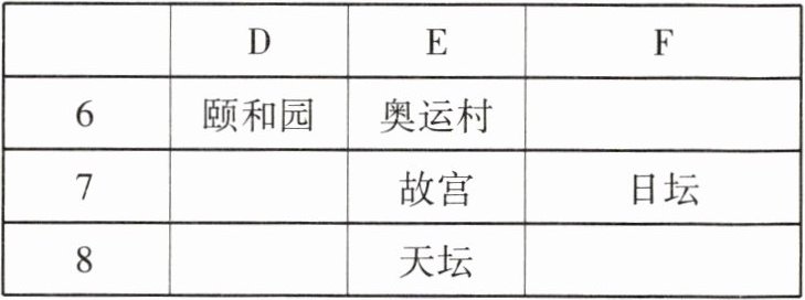 一部分,图中“故宫”“颐和园”所在的区域分别是( )| | D | E | F |
