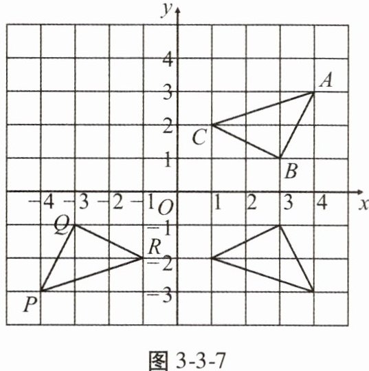 7. 如图 3 - 3 - 7,$\triangle PQR$ 是 $\triangle ABC$ 经过某种变换后得到的图形。如果 $\triangle ABC$ 先变换到第四象限,再变换到第三象限,你认为第一次变换方式是 ______,第二次变换的方式是 ______,$\triangle ABC$ 内任意一点 $M$ 的坐标为 $(a,b)$,那么在 $\triangle PQR$ 中,它的对应点 $N$ 的坐标为 ______。