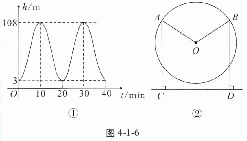 9. 数学活动课上老师提到我们身边很多事物都蕴含着数学知识,班上的数学兴趣小组决定趁着游玩时对摩天轮进行实地调研。摩天轮位于儿童公园内,摩天轮上均匀分布着60个吊舱,顺时针旋转一周需要20min。小组成员使用秒表和手机的测距功能,记录某个吊舱从最低点旋转到不同位置时距地面的高度 $ h $(m)和所用的时间 $ t $(min)的数据,并绘制变化图如图4-1-6①。