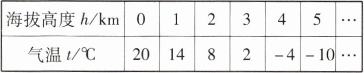 (2)气温t与海拔高度h之间的关系式为t=20-6h。当海拔高度是7km时,对应气温是-22℃。
