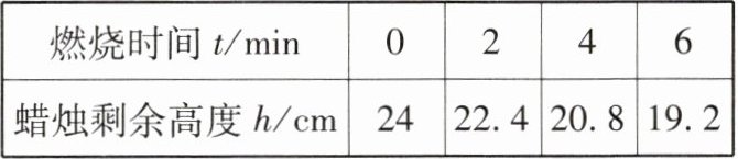 | 蜡烛剩余高度 $ h $/cm | $ 24 $ | $ 22.4 $ | $ 20.8 $ | $ 19.2 $ |