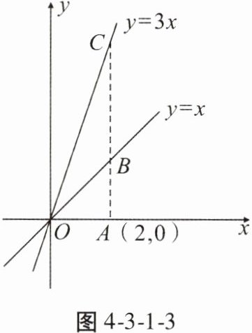 8. 如图 4 - 3 - 1 - 3,过点 $ A(2,0) $ 作 $ x $ 轴的垂线与正比例函数 $ y = x $ 和 $ y = 3x $ 的图象分别相交于点 $ B,C $,求 $ \triangle OCB $ 的面积。