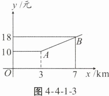 【例2】近几年,网约车逐步成为人们日常出行的主要方式之一,图4-4-1-3反映了某网约车平台收费$y$(单位:元)与所行驶的路程$x$(单位:$km$)的函数关系,其中$AB段的函数表达式为y = 2x + b$。
