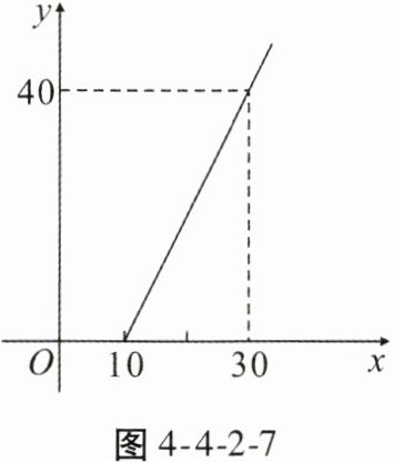 4. 某客运公司规定旅客可以免费携带一定质量的行李,当行李的质量超过规定时,需付的行李托运费 $ y $(元)与行李质量 $ x $($ kg $)之间的关系式为 $ y = 2x - 20 $,图象如图 4 - 4 - 2 - 7。