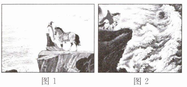 图2 理由:图1中一人站在悬崖上,身旁是一匹战马,面前是一片平静的水面;图2中一人在悬崖上骑着战马,面前是一片波涛汹涌的水面。“秋风萧瑟,洪波涌起”描写的沧海波涛汹涌,气势磅礴,图2能够体现这些特点。