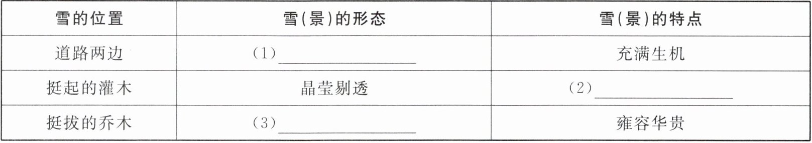 1. 秦岭不同地方的雪(景)形态不同,给人的感受也不同。请你结合文章⑤~⑦段,完成下面的表格。
