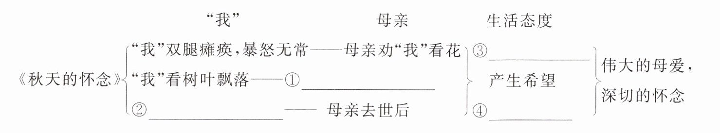 |《秋天的怀念》“我”看树叶飘落——①____|产生希望|