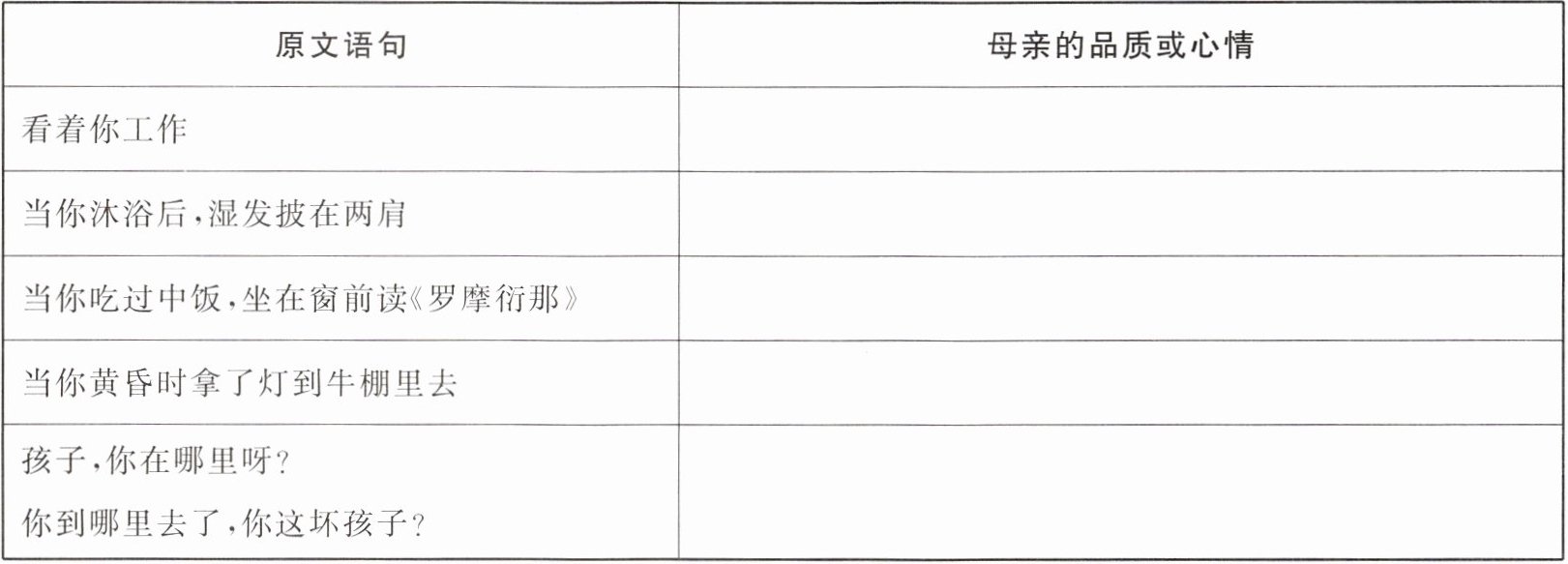 2. 请在对应的语句后面填写上母亲的品质或心情。