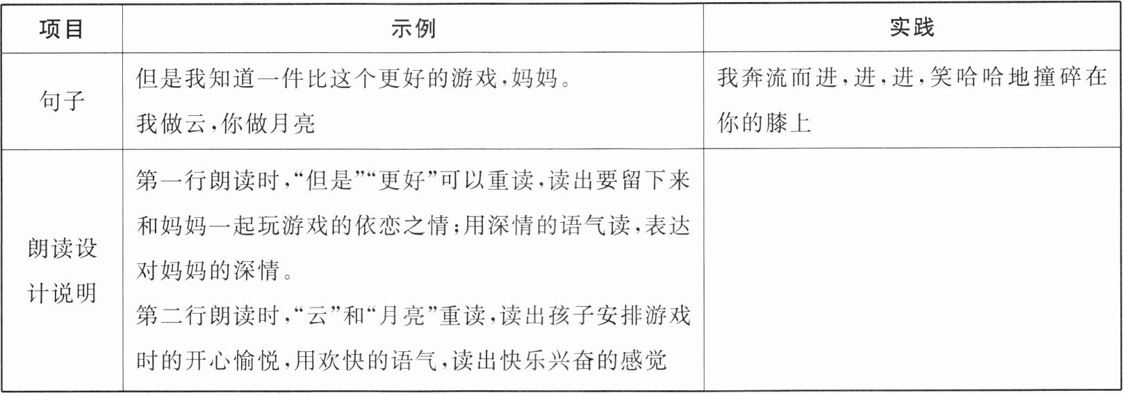 |朗读设计说明|第一行朗读时,“但是”“更好”可以重读,读出要留下来和妈妈一起玩游戏的依恋之情;用深情的语气读,表达对妈妈的深情。第二行朗读时,“云”和“月亮”重读,读出孩子安排游戏时的开心愉悦,用欢快的语气,读出快乐兴奋的感觉| |