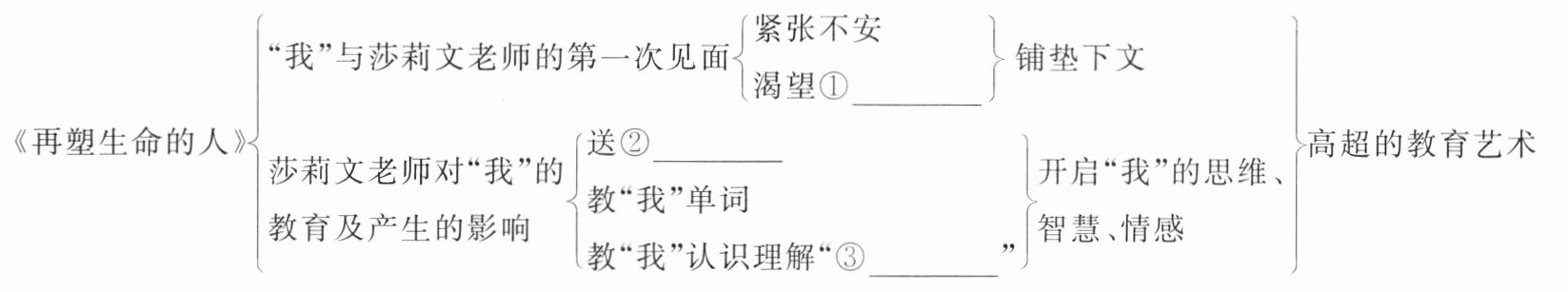 “我”与莎莉文老师的第一次见面⎩⎪⎨⎪⎧ 紧张不安 渴望①____ 铺垫下文