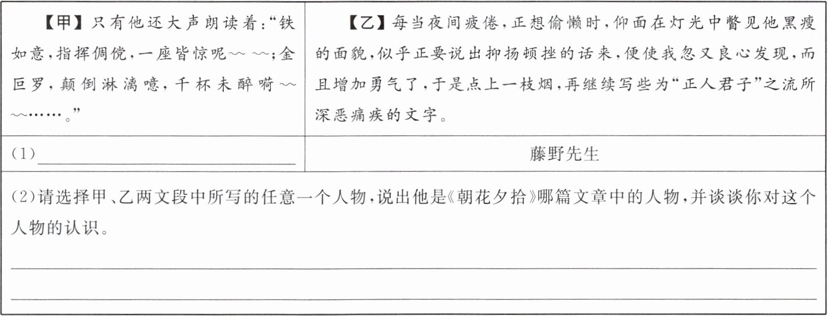 |(2)请选择甲、乙两文段中所写的任意一个人物,说出他是《朝花夕拾》哪篇文章中的人物,并谈谈你对这个人物的认识。|
