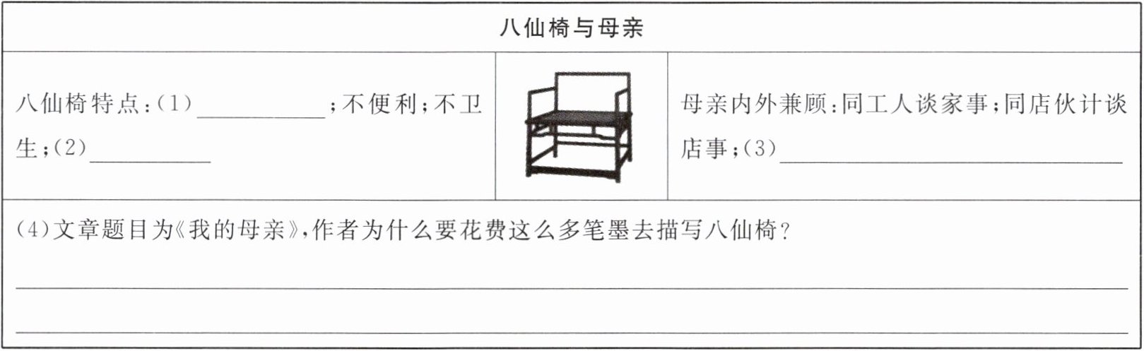 |(4) 文章题目为《我的母亲》,作者为什么要花费这么多笔墨去描写八仙椅?|