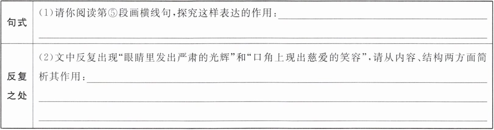 |反复之处|(2) 文中反复出现“眼睛里发出严肃的光辉”和“口角上现出慈爱的笑容”,请从内容、结构两方面简析其作用:______|