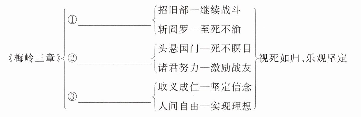 $《梅岭三章》 \left\{ \begin{array} { l } { \textcircled { 1 } $_________$ \left\{ \begin{array} { l } { 招旧部一继续战斗 } \\ { 斩阎罗一至死不渝 } \end{array} \right. } \\ { \textcircled { 2 } $_________$ \left\{ \begin{array} { l } { 头悬国门一死不瞑目 } \\ { 诸君努力一激励战友 } \end{array} \right. } \\ { \textcircled { 3 } $_________$ \left\{ \begin{array} { l } { 取义成仁一坚定信念 } \\ { 人间自由一实现理想 } \end{array} \right. } \end{array}\right. } \right. 视死如归、乐观坚定$