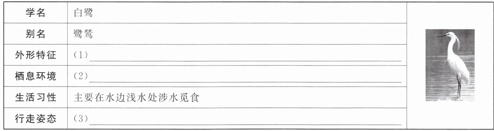 5. 【动物名片】小深想制作一张“鹭鸶名片”,请结合文章的相应内容,完成下表。