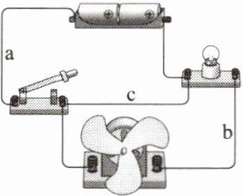 解析 闭合开关后,电流从电源正极出发经过开关后再回到电源负极,小灯泡和小风扇中没有电流流过,电源被短路,电路中会有很大的电流,会损坏电源;若想保证电路安全且小灯泡和小风扇能正常工作,只需将导线c拆除即可。