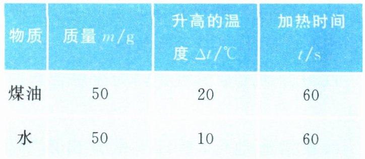 (2)用同一加热器加热相同时间,水和煤油吸收的热量相同,由题表数据可知,煤油的温度升高得多,水的温度升高得少,说明水的吸热能力更强。