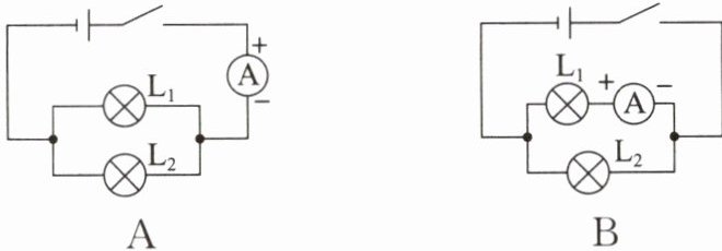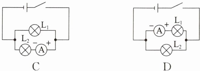 解析 选项A中,电流表在干路上,电流表测干路电流,A不符合题意;选项B中,电流表的正负接线柱接反了,不能测$L_1$的电流,B不符合题意;选项C中,两灯泡并联,电流表与$L_2$串联,测$L_2$支路的电流,不能直接测量通过$L_1$的电流,C不符合题意;选项D中,电流表与$L_1$串联,能直接测量通过$L_1$的电流,D符合题意。故选D。