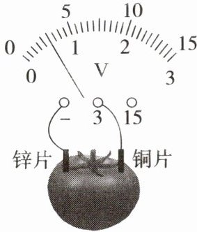 在西红柿上相隔一定距离分别插入铜片和锌片,即制作成西红柿电池。将铜片、锌片与电压表相连,如图所示。下列说法正确的是(