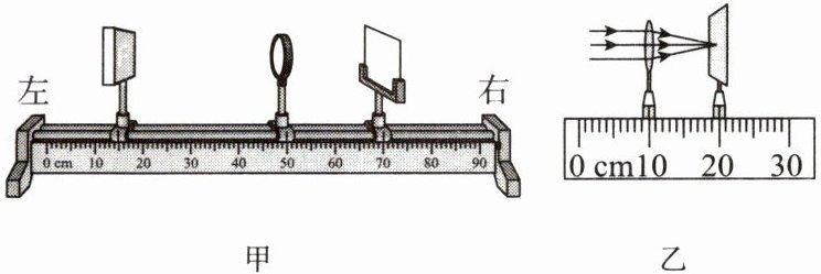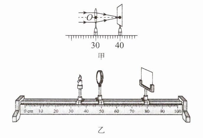 b. 测焦距:探究前,先测量凸透镜的焦距。如图乙所示,一束平行于主光轴的光线经凸透镜后,在光具座的光屏上形成了一个最小、最亮的光斑,此时该凸透镜的焦距为$10.0\ cm$。