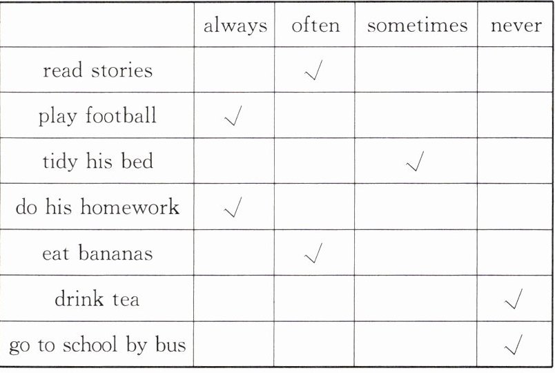 He often reads stories. He loves reading. He always plays football. He plays football every day. He thinks it is good for him. He sometimes tidies his bed and he always does his homework. He often eats bananas, but he never drinks tea. He doesn’t like tea. He never goes to school by bus.
