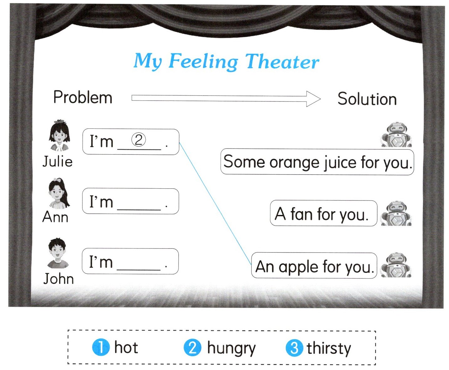 心情驿站的老师带大家观看了情绪主题剧场,你还记得剧中三个小朋友分别有哪些感受吗?机器人是如何巧妙解决的呢?请再听录音,选择合适的单词填空并连线。