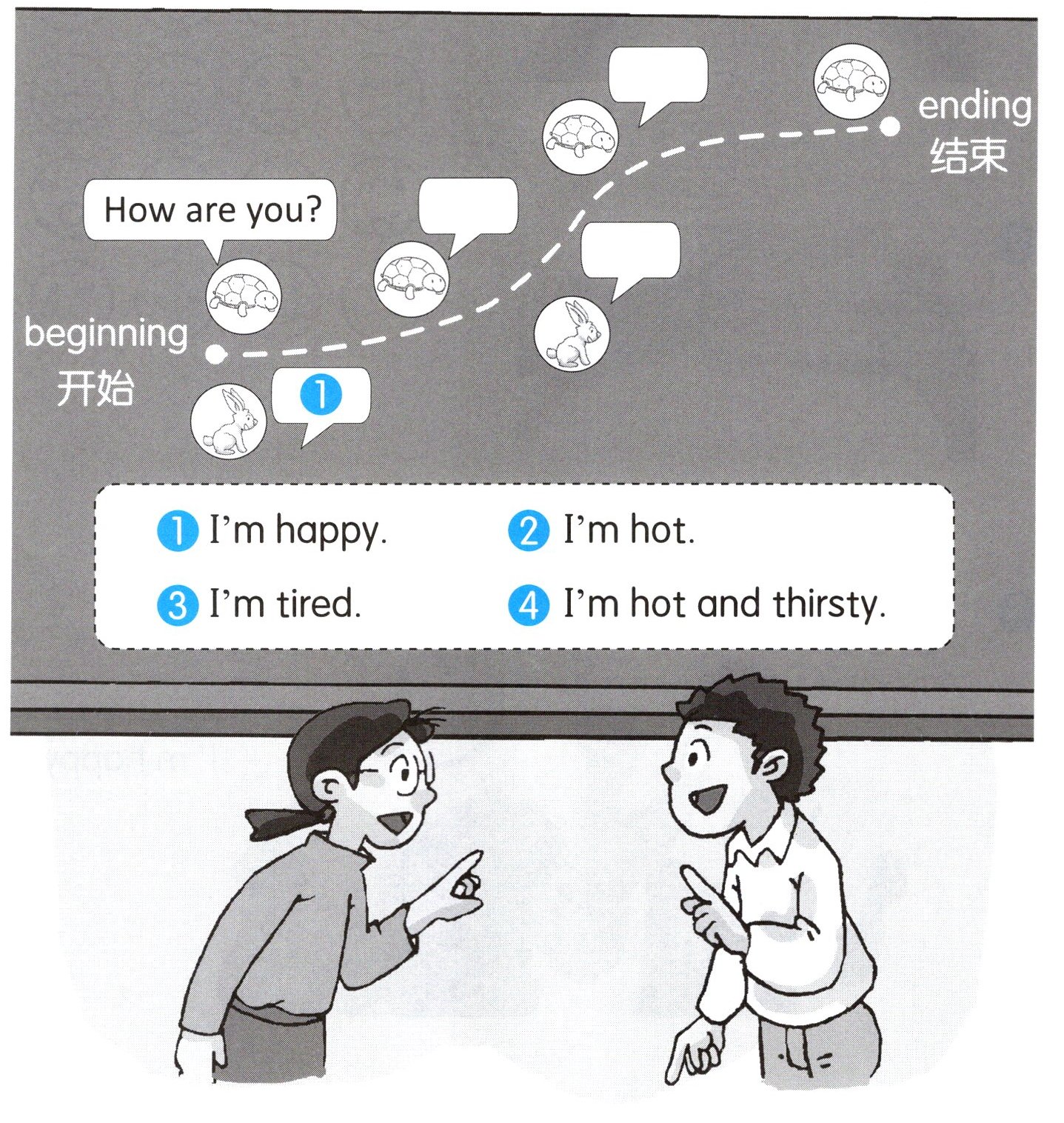 在情绪故事剧场上,小朋友正在表演龟兔赛跑的故事。你还记得故事中的小兔子和小乌龟有什么感受吗?选择合适的句子,将编号填入对话框内。