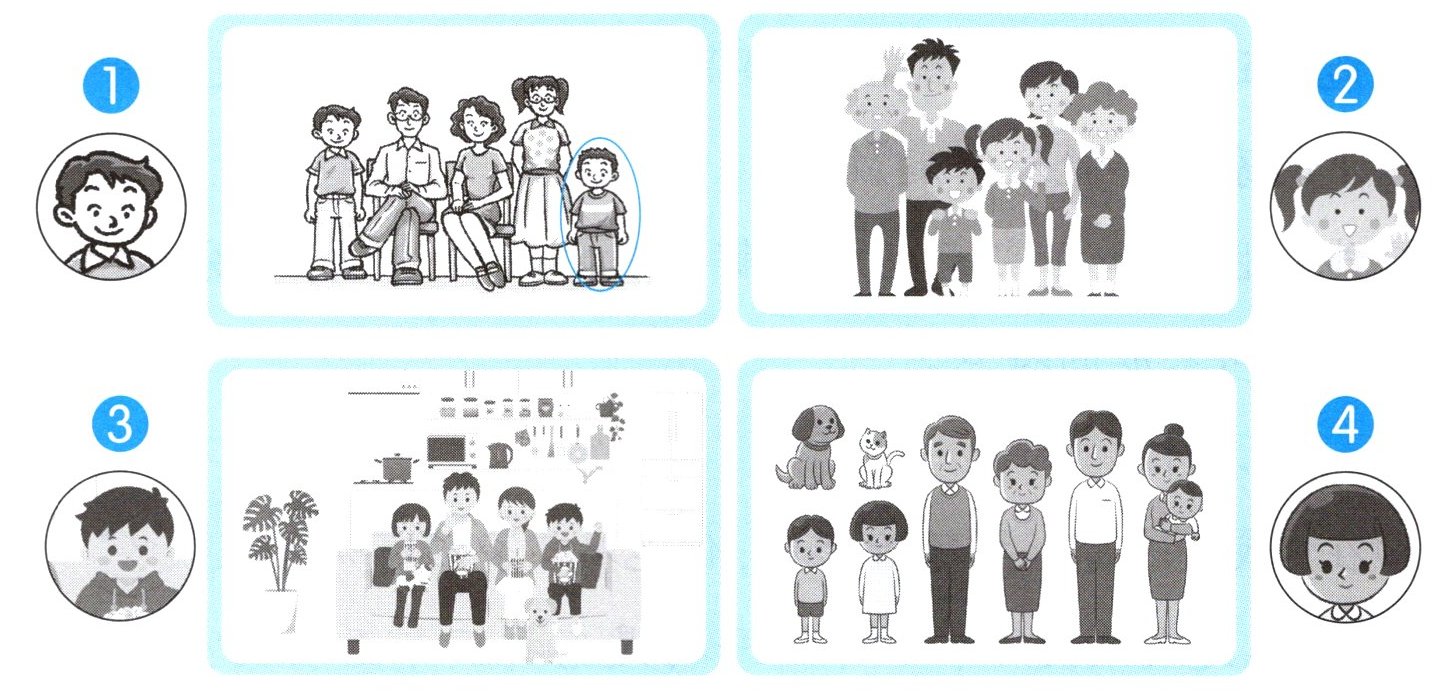 学校“我爱我家”主题活动开始啦!在全家福照片展上,以下几位小朋友正在用照片来介绍家人。听一听,圈出你所听到的人物。也请你试试,用照片来介绍你的家人吧!