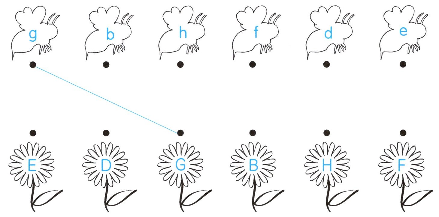 将蜜蜂g与花朵G相连,蜜蜂b与花朵B相连,蜜蜂h与花朵H相连,蜜蜂f与花朵F相连,蜜蜂d与花朵D相连,蜜蜂e与花朵E相连。