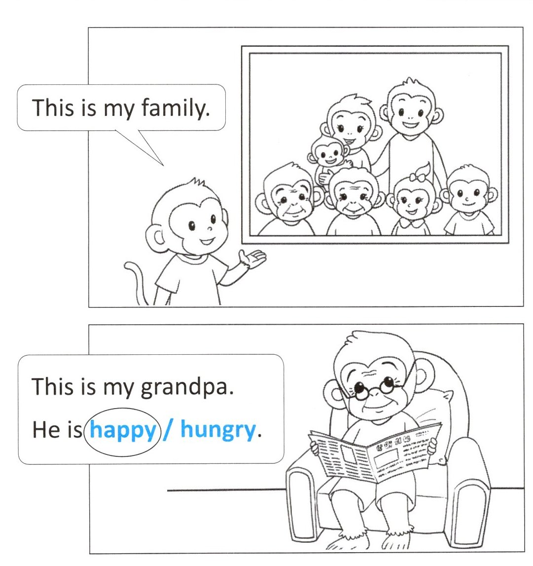 小朋友,请你读一读 Monkey 一家人的故事,观察图片圈出人物对应的状态吧。