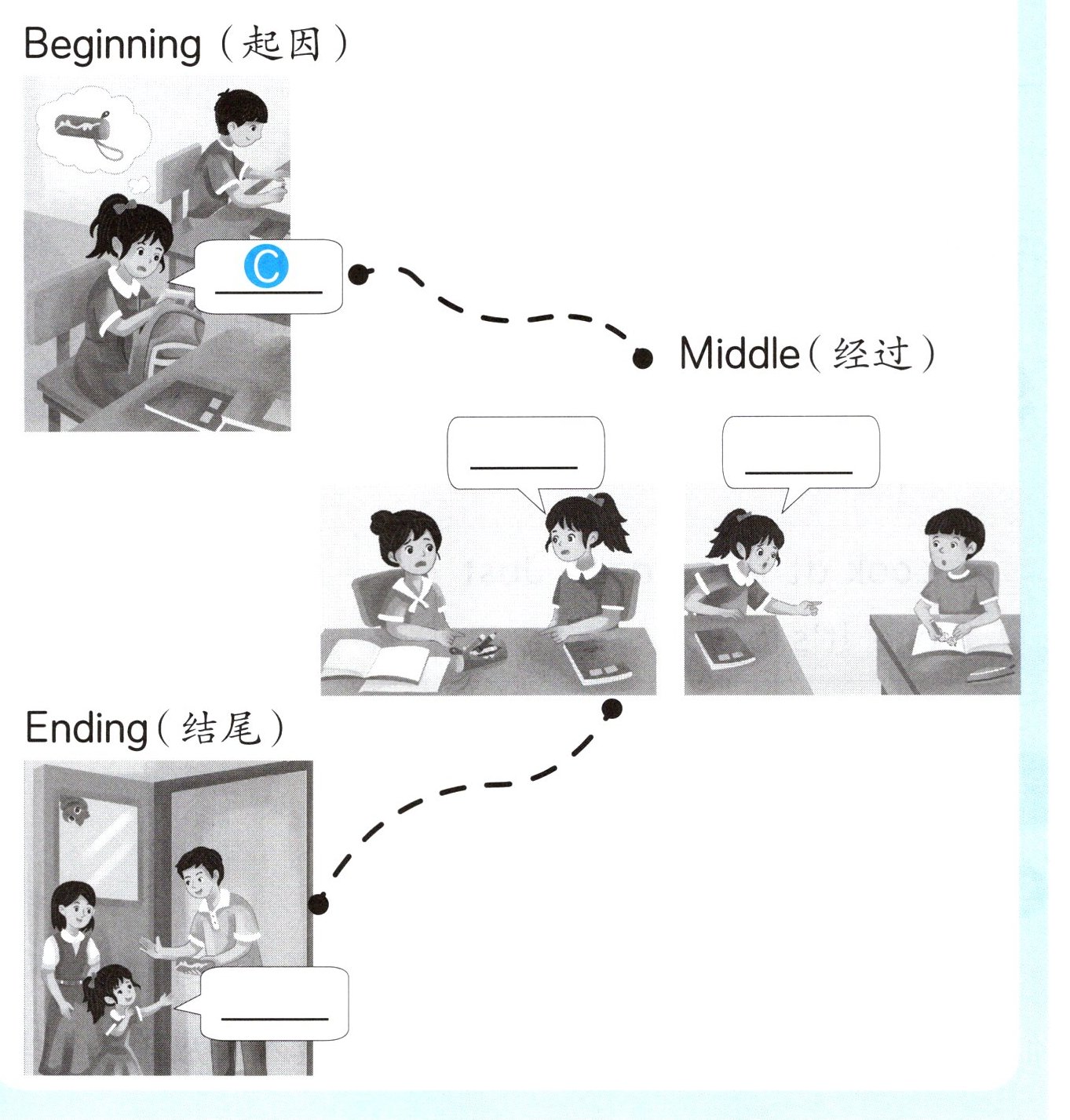 在主题周活动中,同学们阅读了一个关于文具的故事,他们正在整理故事海报,你能把正确的编号填入相应的位置吗?
