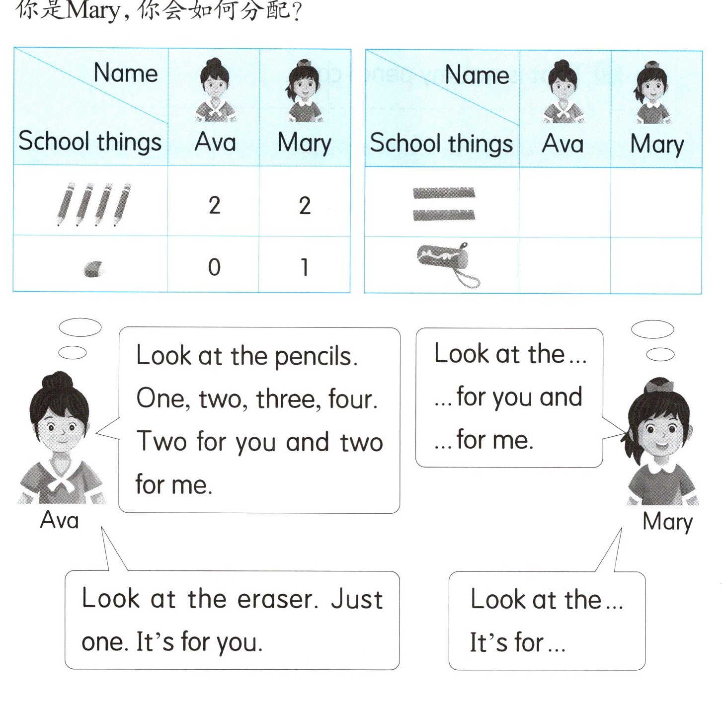 清点完毕后,Miss Jones 奖励了 Ava 和 Mary 一些文具,如果你是 Mary,你会如何分配?