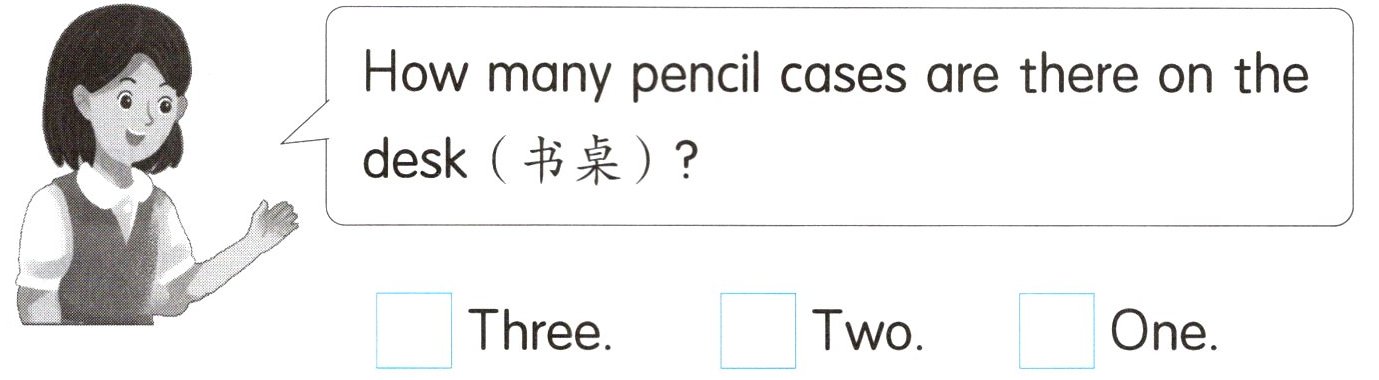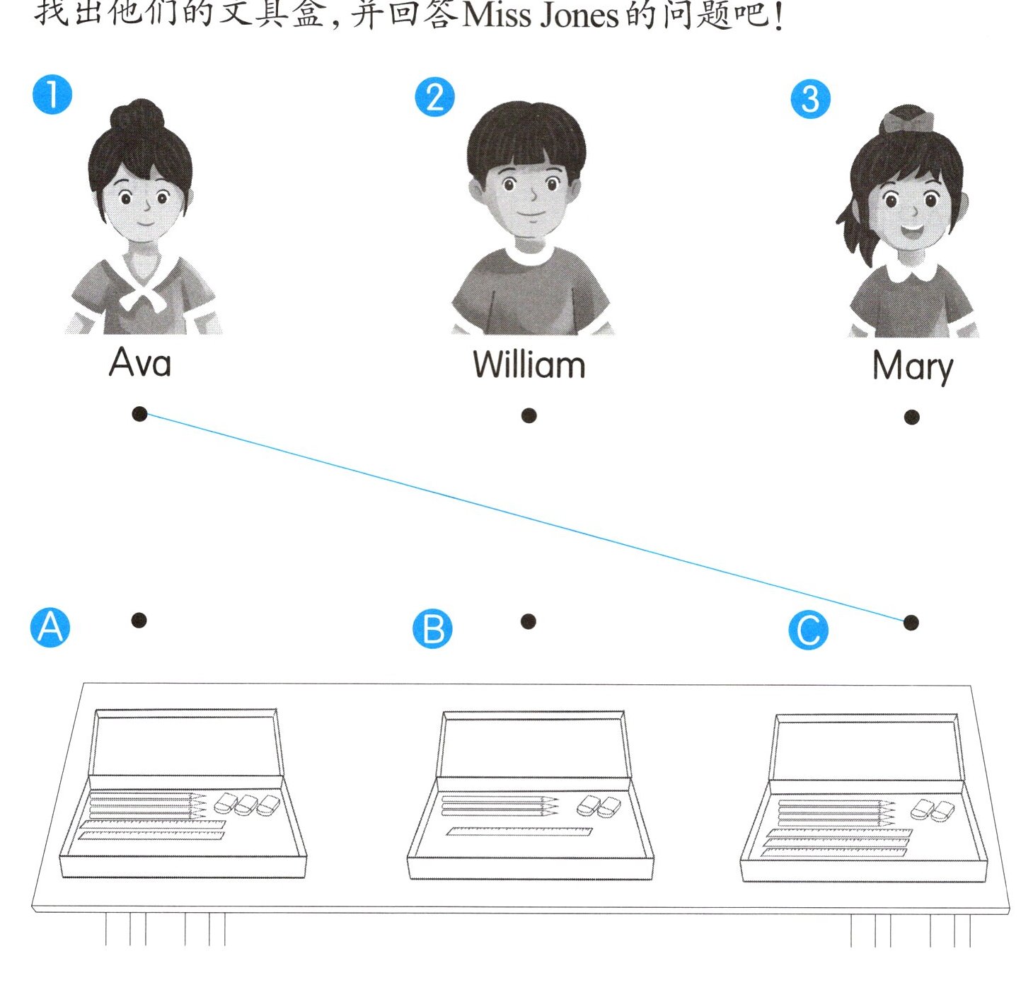 从故事中,孩子们学会了要收纳好自己的文具。班里有三位同学被评为“文具收纳小达人”,请听一听他们的描述,连线找出他们的文具盒,并回答 Miss Jones 的问题吧!