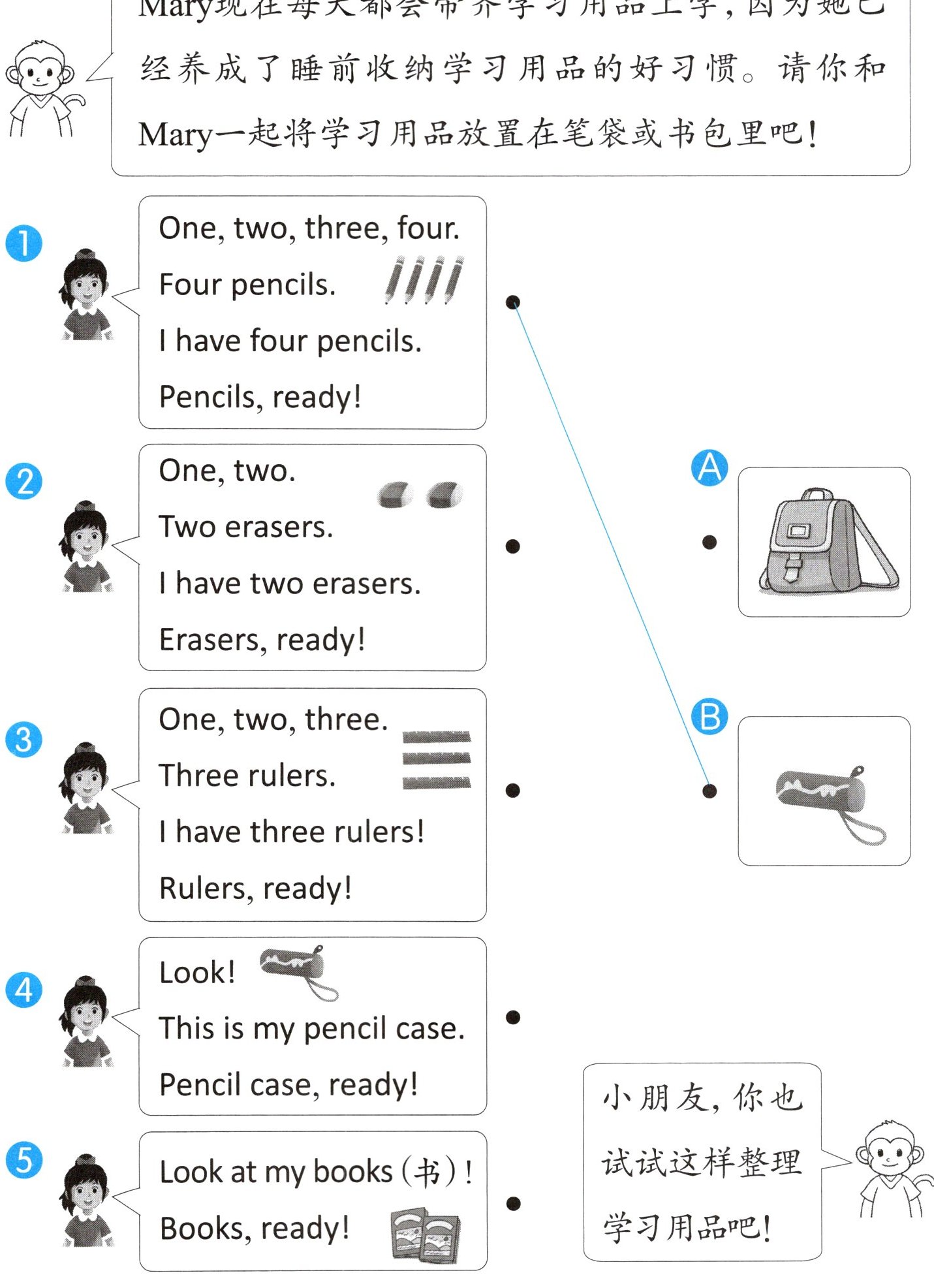 Mary 现在每天都会带齐学习用品上学,因为她已经养成了睡前收纳学习用品的好习惯。请你和 Mary 一起将学习用品放置在笔袋或书包里吧!