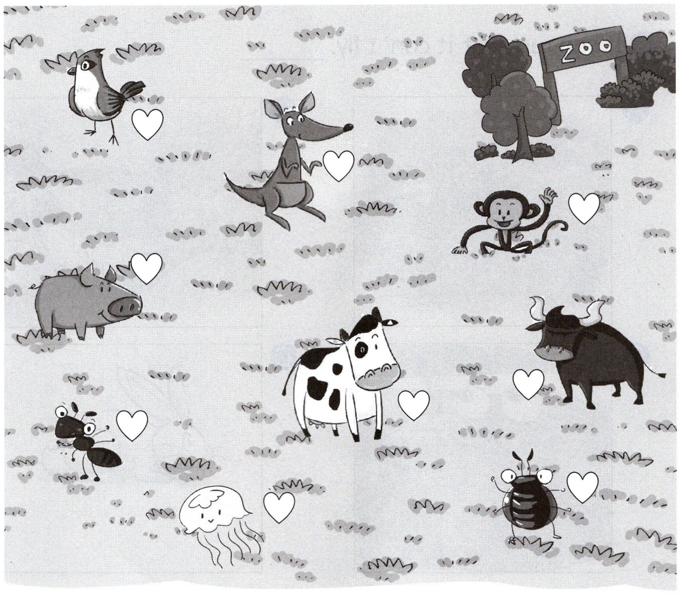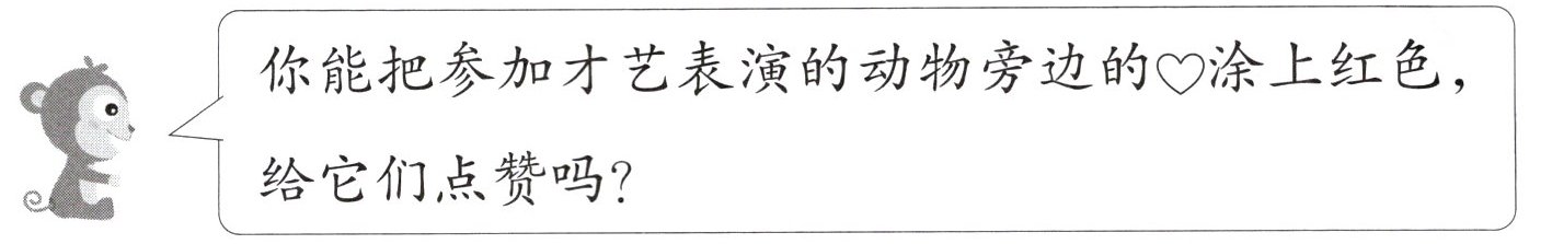 你能把参加才艺表演的动物旁边的❤️涂上红色,给它们点赞吗?