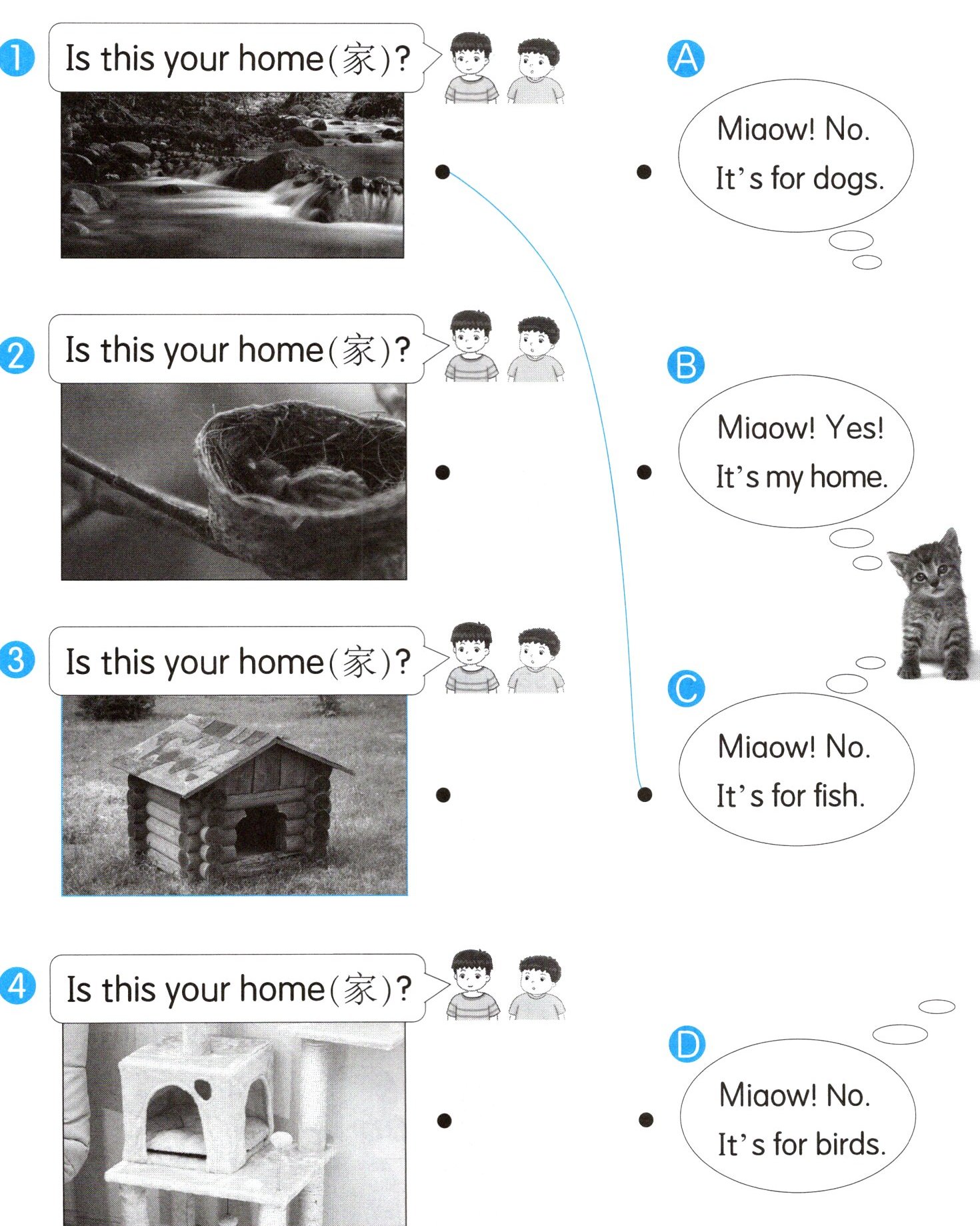Chenchen和Wenwen发现了一只迷路的baby cat,我们一起帮忙把它送回家吧。请你读一读,连一连。