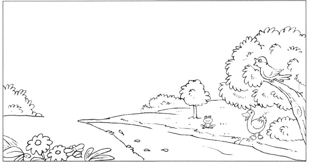 (树、青蛙:涂成绿色;鸟、鸭子:涂成白色;两朵花:涂成黄色)