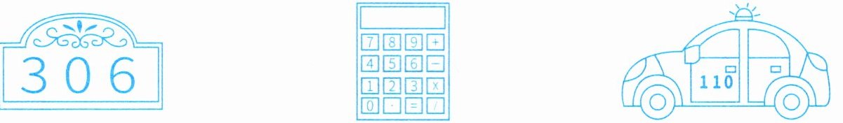 根据题目要求,需圈出物品中的“0”。插图1包含三个物品:标有“306”的牌子(其中“0”在中间)、计算器(数字键中有“0”)、标有“110”的汽车(其中“0”在末尾)。