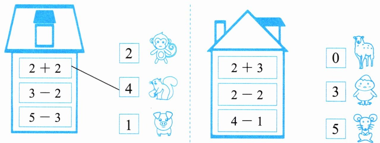猴子连2+2-右一(即第一个房子中算式结果对应的右边的第一个动物,以下同理);